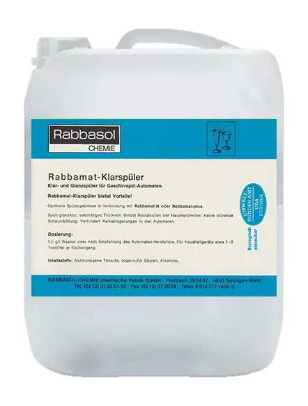 Klar- und Glanzspüler für Geschirrspülautomaten. Rabbamat Klarspüler erzielt optimale Spülergebnisse in Verbindung mit Rabbamat oder Rabbamat-plus. Spült glanzklar, selbsttätiges Trocknen. Bindet Restalkalien der Spülmittel. Keine störende Schaumbildung. Verhindert Kalkablagerungen in den Automaten.